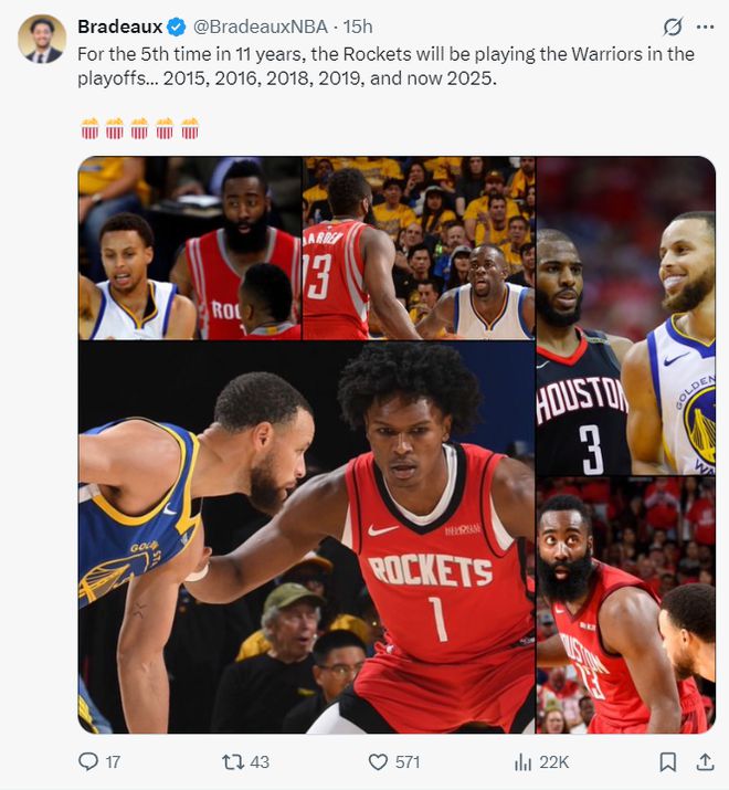 休媒Bradezux写道:在过去11年里火箭队在季后赛已经第五次与勇士相遇:2015年、2016年、2018年、2019年、2025年。